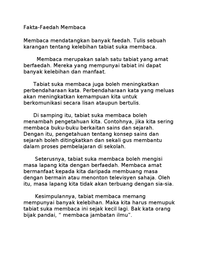 . Mereka yang mempunyai tabiat ini dapat memperoleh banyak kelebihan dan manfaat. Contoh Karangan Fakta Tahun 5. Apatah lagi pada masa ini bahan bacaan yang sesuai seperti surat khabar majalah dan sebagainya sangat mudah kita dapati seperti di kedai-kedai berdekatan rumah atau melalui internet.